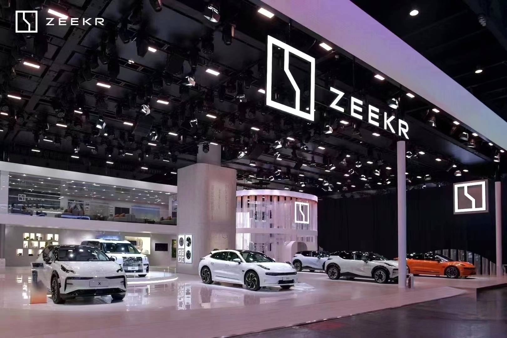 開放性布局:極氪展臺采用開放性布局和簡約的設計,打破了空間的沉悶感,增強了視野通透感。這種設計讓觀眾能夠更加自由地瀏覽和欣賞展品,同時也提升了展臺的整體美感和舒適度。