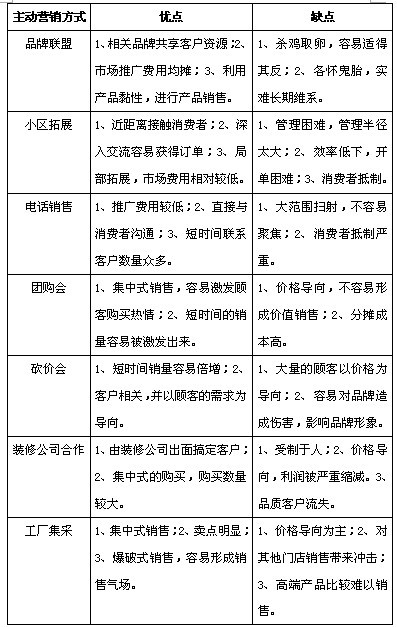 設計師通路、裝修公司、團購會、砍價會、工廠集采等方式。作為主動營銷的最主要的特征就是,用積極的方法去主動尋找和開發客戶,并最終達到成交的目的。