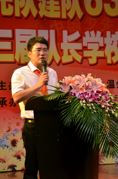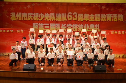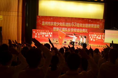 10月13日下午,溫州市慶祝建隊63周年暨溫州市第三屆少先隊隊長學(xué)校結(jié)業(yè)典禮在市青少年活動中心觀演廳隆重舉行。共青團(tuán)溫州市委書記王忠寶、副書記沈醒、市教育局體衛(wèi)藝處處長、市少工委副主任李珍陽、浙江電視臺少兒頻道節(jié)目部副主任朱笑旦、市文明辦未成年處副處長、市少工委副主任石富興、團(tuán)市委學(xué)少部副部長、市總輔導(dǎo)員葛紅敏等嘉賓領(lǐng)導(dǎo)以及優(yōu)秀大隊輔導(dǎo)員、隊長學(xué)校指導(dǎo)老師、學(xué)員家長等400多人出席典禮。