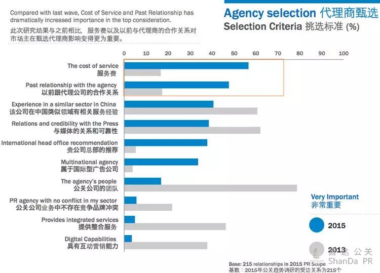 “57%的營銷人員將服務(wù)費(fèi)作為甄選的首要因素,該比例2013年僅為13%,”R3公司執(zhí)行董事Sabrina Lee介紹:“單憑這一點(diǎn),我們就可以估計(jì)到中國公關(guān)業(yè)將要面臨新的挑戰(zhàn)與面貌。”