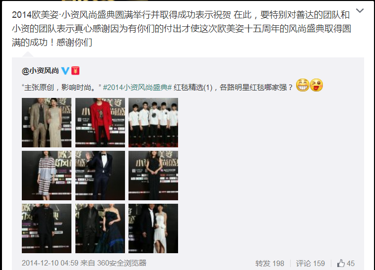 2014年12月9日晚,歐美姿·小資風(fēng)尚盛典在上海梅賽德斯奔馳文化中心圓滿落幕,此次盛典以“主張?jiān)瓌?chuàng),影響時(shí)尚”為宗旨,攜手眾多明星,聯(lián)合各大時(shí)尚