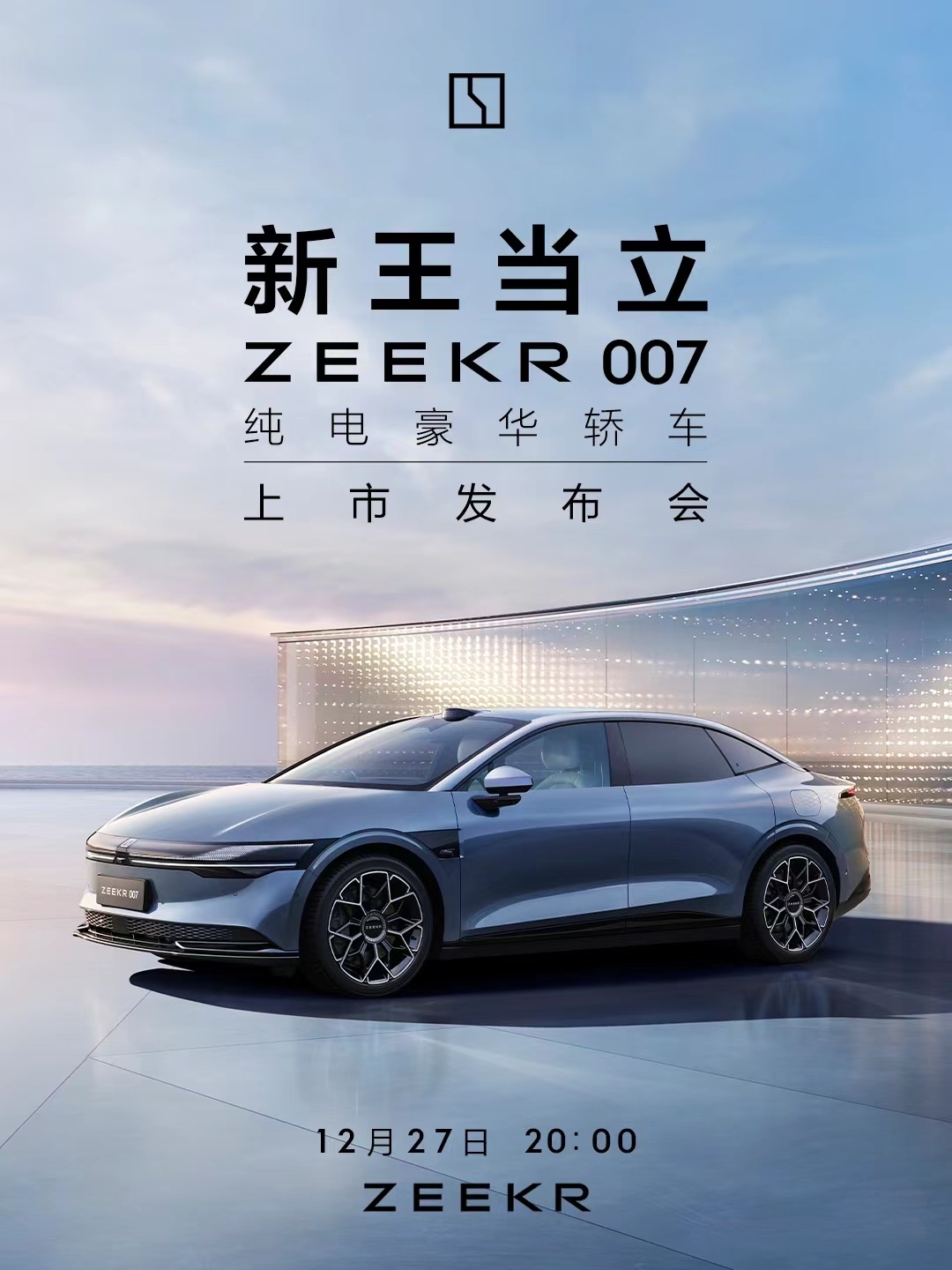 發布會的主KV(Key Visual)設計簡潔而富有沖擊力。畫面以極氪007的輪廓為主體,背景采用深邃的星空藍,象征著科技與未來的無限可能。車輛前臉的隱藏式燈帶與車身線條流暢融合,展現出極氪007獨特的設計美學。