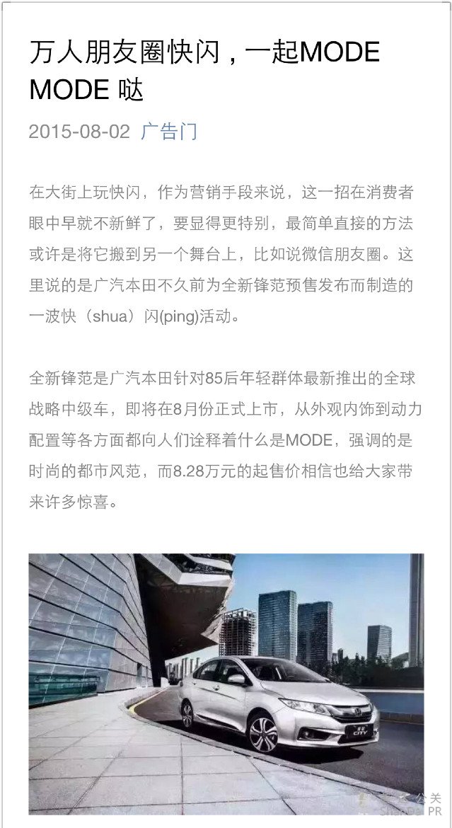 在大街上玩快閃,作為營銷手段來說,這一招在消費者眼中早就不新鮮了,要顯得更特別,最簡單直接的方法或許是將它搬到另一個舞臺上,比如說微信朋友圈。這里說的是廣汽本田不久前為全新鋒范預售發布而制造的一波快(shua)閃(ping)活動。