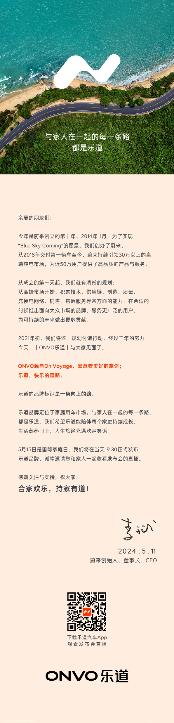 蔚來創始人、董事長、CEO 李斌在社交媒體上發表了一封信,為“樂道”品牌預熱